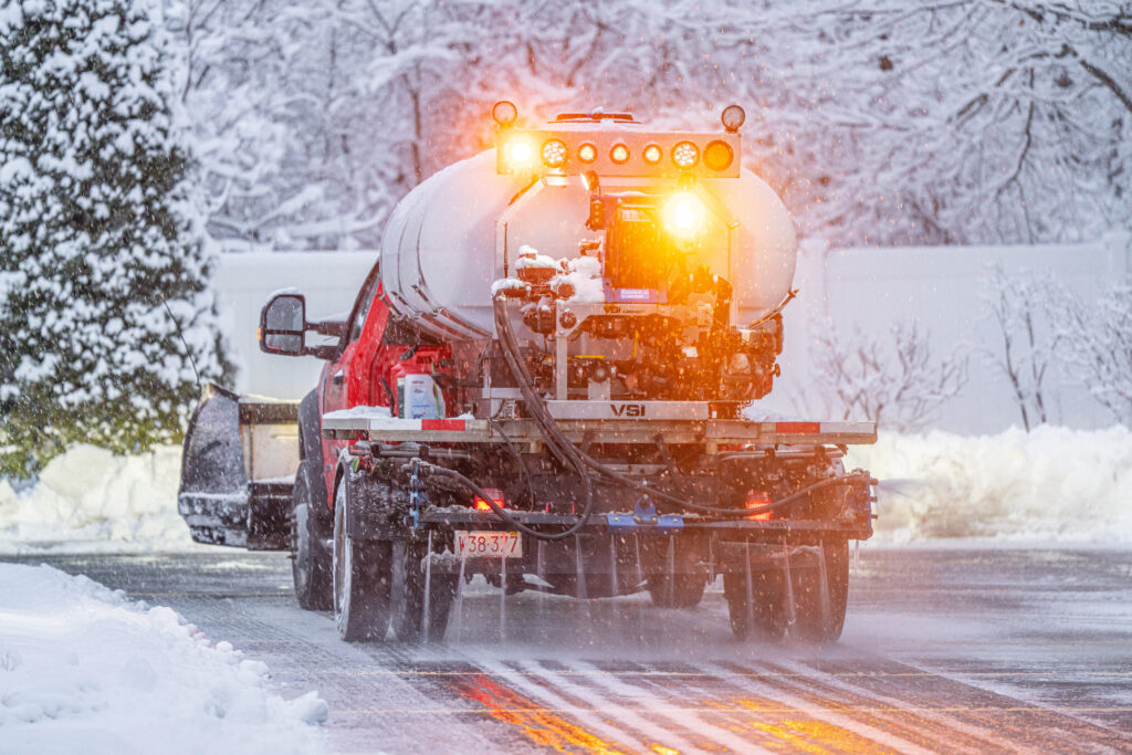 For pre- and post-storm snow and ice control, we offer a cleaner, more environmentally friendly solution by using liquid brine—an effective alternative to traditional rock salt. We make and apply our own brine using VSI by BOSS equipment, through our sister company, Northeast De-Icing Solutions.